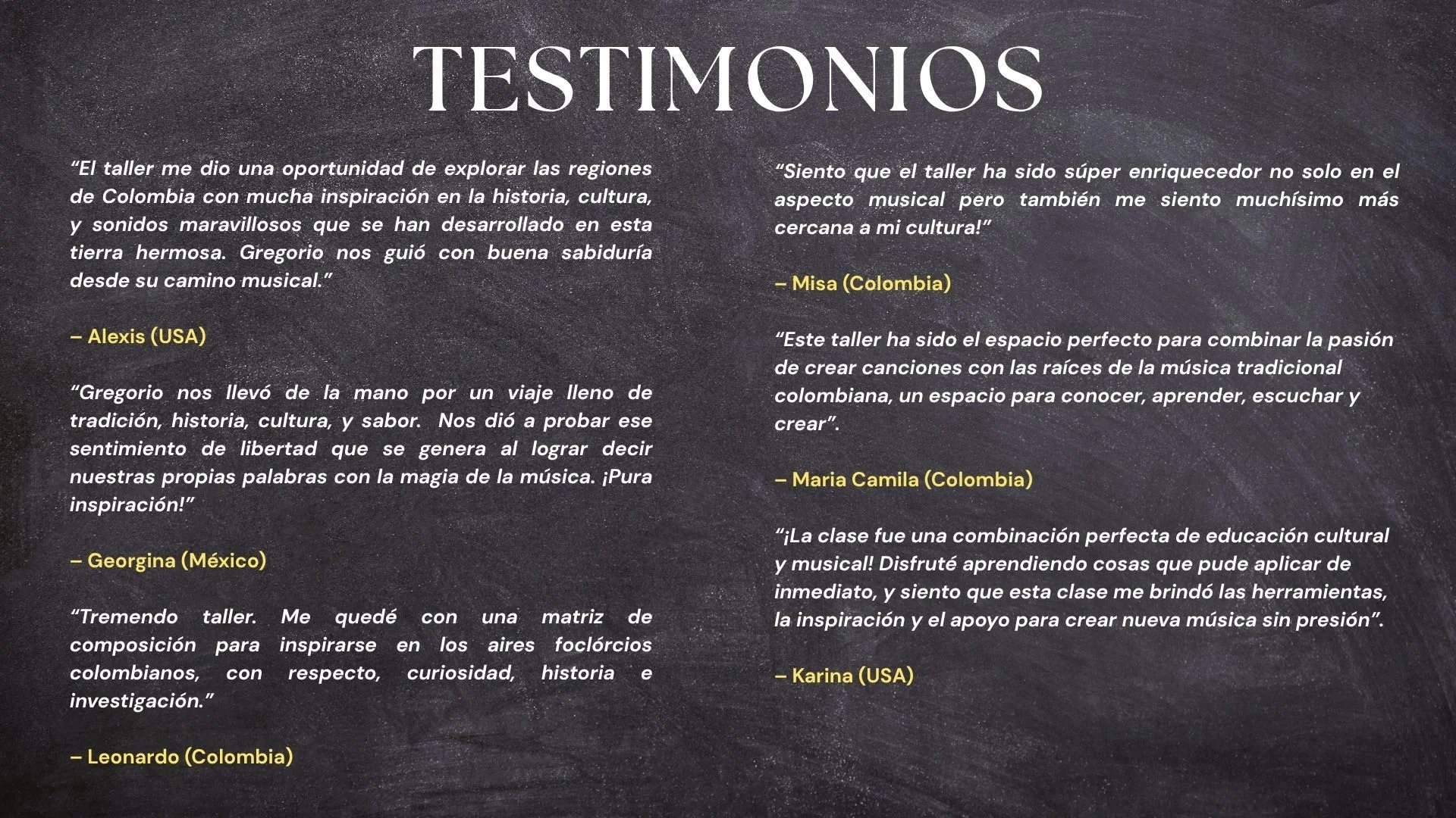 Gregorio and his orchestra offer a variety of unique workshops and artist residencies. If you are interested in hiring their services for educational purposes please visit our "Contact" section.